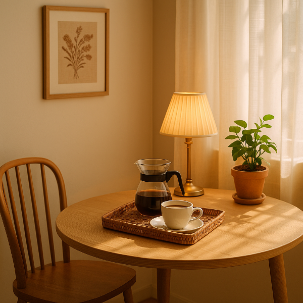 테이블이 작아도 괜찮아요. 컵 하나, 책 한 권, 조명 하나만으로도 공간에 깊이가 생깁니다.